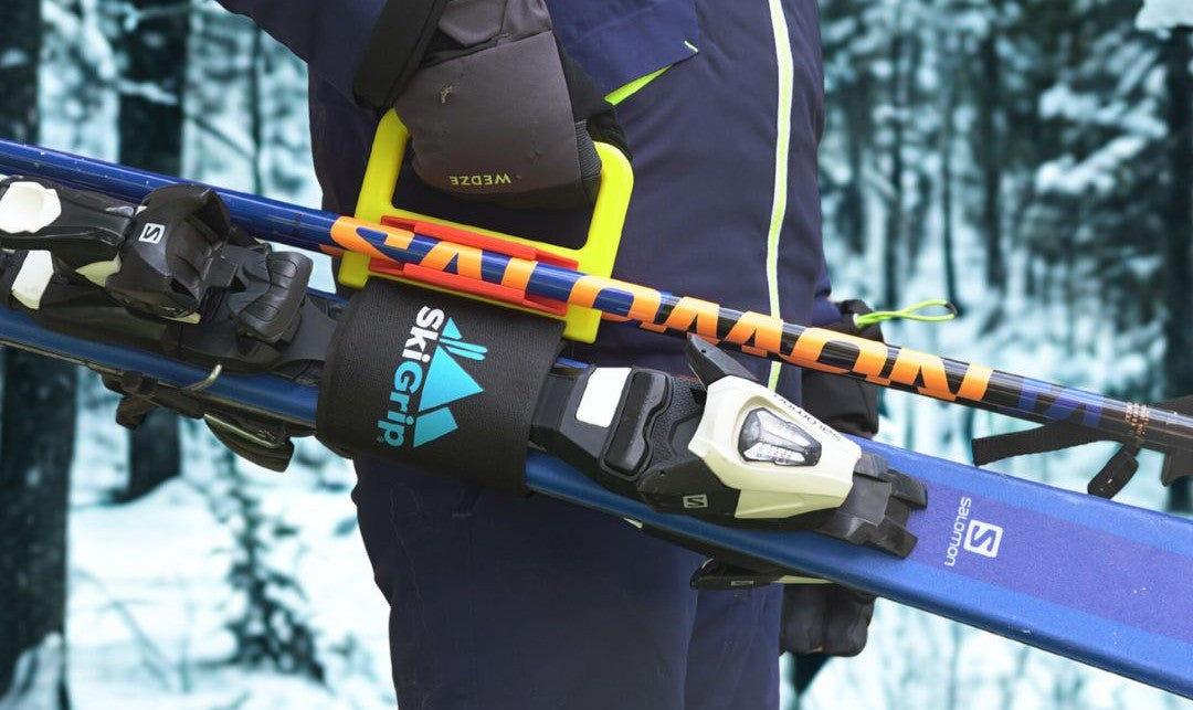 Mit SkiGrip können Sie Skier und Stöcke mit nur einer Hand tragen.